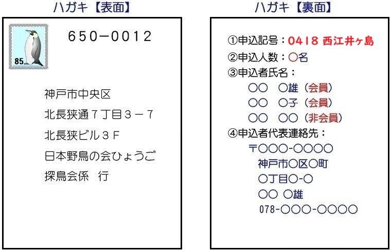 参加申込 はがきに、①~④を記入して事務所に郵送してください。