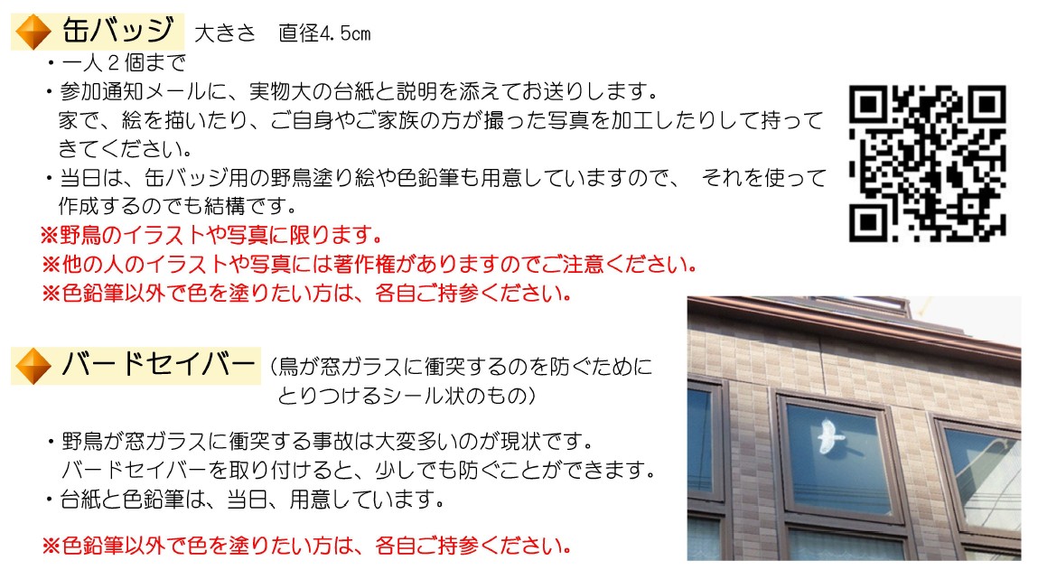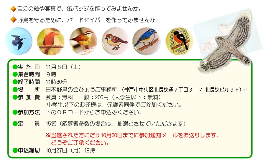 日本野鳥の会ひょうごの事務所で「野鳥オリジナル缶バッジ&バードセイバーを作ろう!」を開催します。
